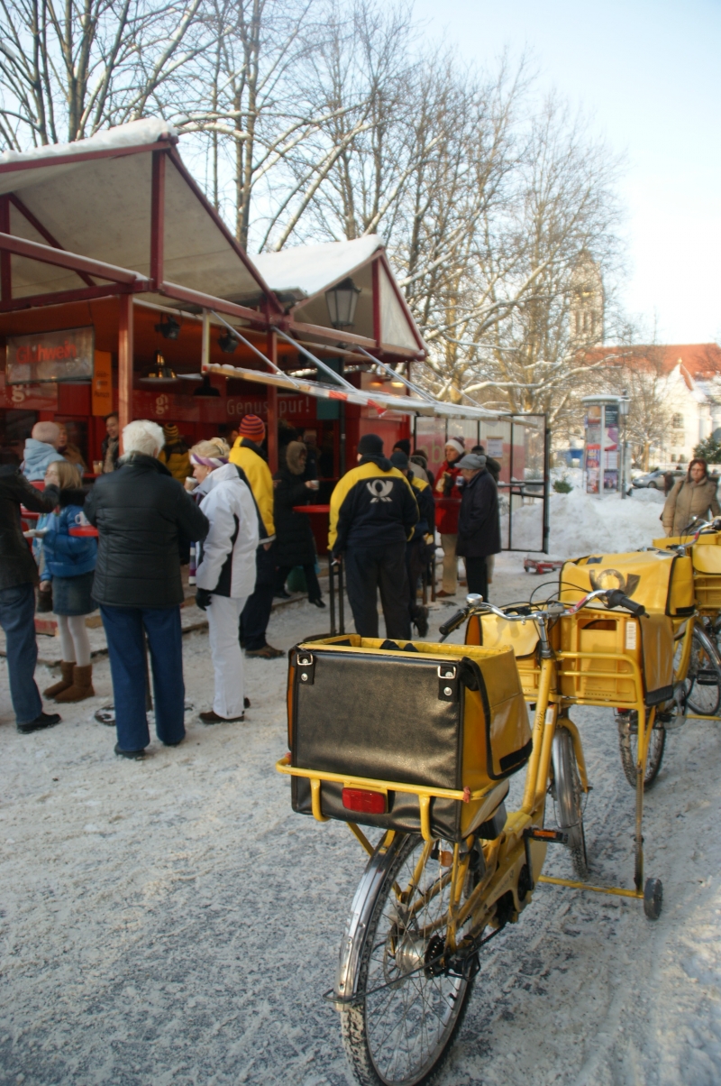 寒い中での配達時、休憩したくなることもあると思います。でも日本ではなかなかこんな光景は見られない!郵便局員さんたちが、配達途中にこぞってマルクトのスタンドに寄って一休み。筆者はそんな光景が普通に見られるミュンヘンが大好きでした。