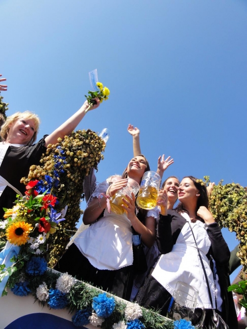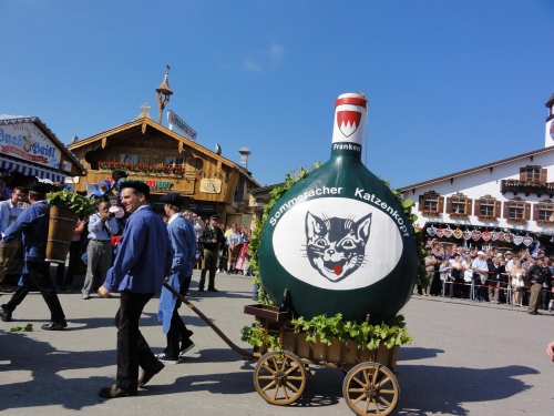 正午を迎えるころ、ビール樽はそれぞれのテントに到着し、パレードはクライマックスを迎えます。山車に乗った出演者たちも、各自手にしたマスジョッキのビールを飲み干す勢いで、陽気に沿道の観客に向かって手を振ってくれます。