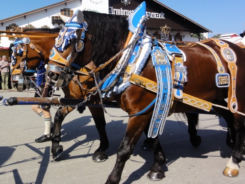 パレードでは、樽が積まれた馬車を引く“馬”にもご注目を。こちらも醸造メーカー特注のゴージャスな馬具で飾り立てられ、迫力ある行進を見せてくれます。ドイツでは馬はとても愛されている動物で、市中で間近に見る機会も多いのですが、やはり華やかな馬具をまとった馬は見ごたえがあります。