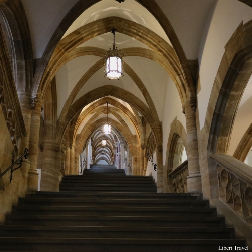 新市庁舎の中は無料で見学することができます。外観も美しいですが、中もレトロなライトや天井、カラフルなステンドグラスなど、写真映えするポイントが盛りだくさんです。