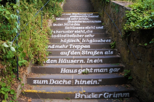 旧市街からマールブルク城を結ぶまでの道のりには、Grimm-Dich-Pfadと名付けられた、総距離2Km弱の散策ルートがあります。街中のあちこちに、グリム童話にまつわるオブジェ等があり、この街に潜む可愛らしいグリムの世界を肌で感じることができます。昔読んだことある童話の内容を思い出しながら歩いていると、どこかノスタルジックな気分になります。ルートマップは公式HPにて事前に確認もできます。