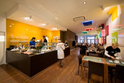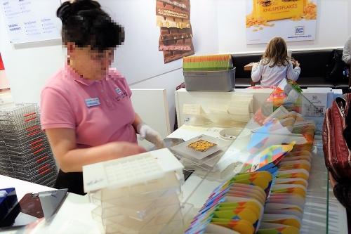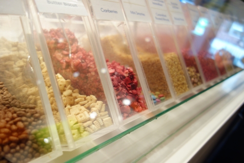 店内はパッケージの通りカラフルなインテリアで、リッタースポーツのチョコレートのほぼすべての味が揃っています。それだけでなく、通常は販売されていないお徳用パックや、好きな味を計り売りで詰め合わせて購入できるシステムもあり、お土産選びにももってこい☆またショップバッグやオリジナルグッズなども販売されています。