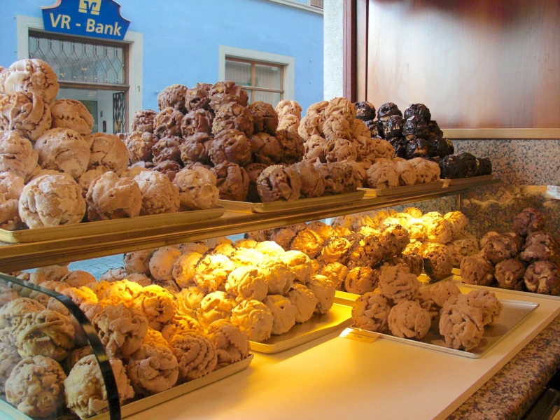 マルクト広場の周辺にはたくさんのお土産屋さんがありますが、その中でも目立つのは「Schneeball シュネーバル」という伝統菓子のお店。
