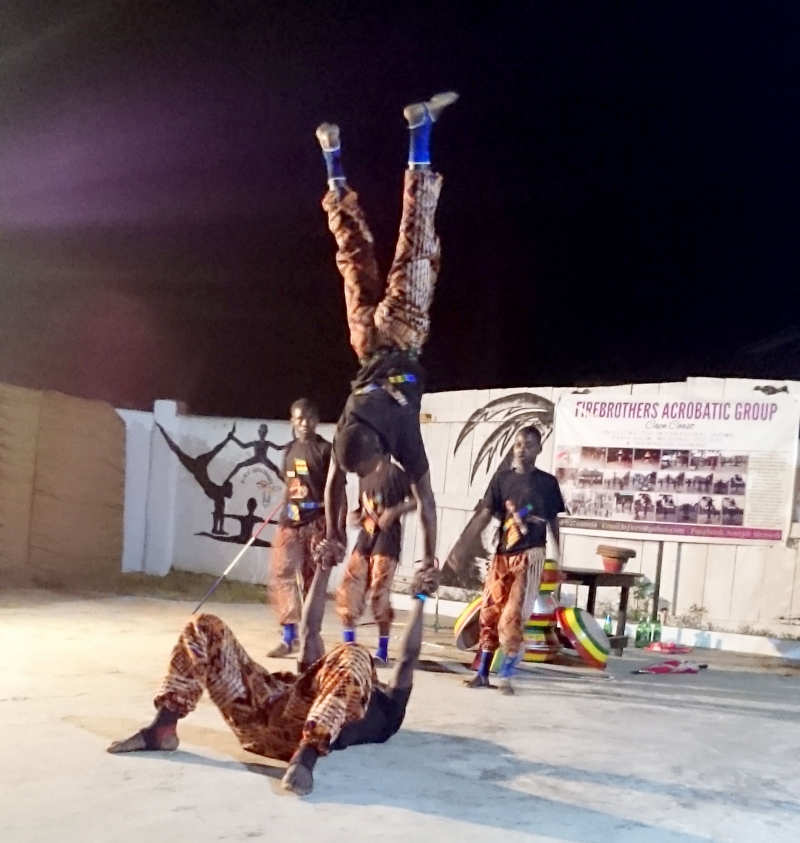 前述のOasis Beach Resortでは、毎週末の夜20時頃からアクロバットショーを開催しています。ホテルのレストランで食事をしながら、ショーを楽しむことができるのでお勧めです。ガーナ人らしい、力強いパフォーマンスに圧倒されます。