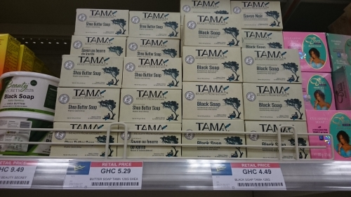• 写真:Adjoaシアバターソープ(5.29セディ≒118円)/ブラックシアソープ(4.49セディ≒100円)