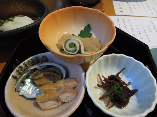 まず、前菜や刺身からいただきましょう。枝豆豆腐やたたき牛蒡、鮑などが並び、お酒が進みそうですね。刺身は、まぐろ、いか、かんぱち、甘エビの4種です。