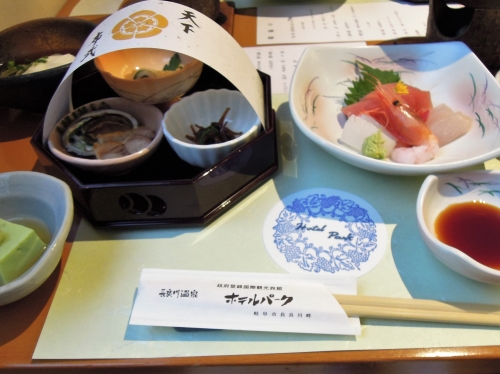 ホテルパークでは、岐阜県や長良川流域の名物を取り入れた料理が味わえます。様々な宿泊プランがありますが、ぜひ食事付きのプランを選んで、味わってみることをおすすめします。こちらでは、筆者が選択したプラン(1泊2食付き12,000円/人 税抜)の料理を紹介します。