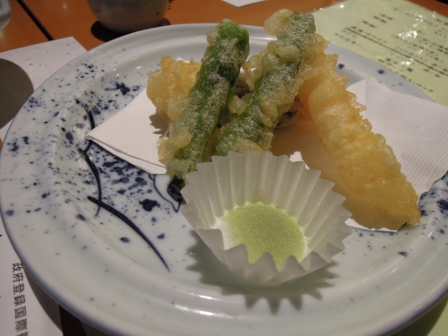 揚げたての天ぷらは、海老、しし唐、河ふぐの紫蘇巻きの3種です。この「河ふぐ」とは、岐阜県飛騨地方では、ナマズのことを指すそうです。河ふぐの天ぷらは、意外にもくせがなく、柔らかな食感で食べやすいですよ。