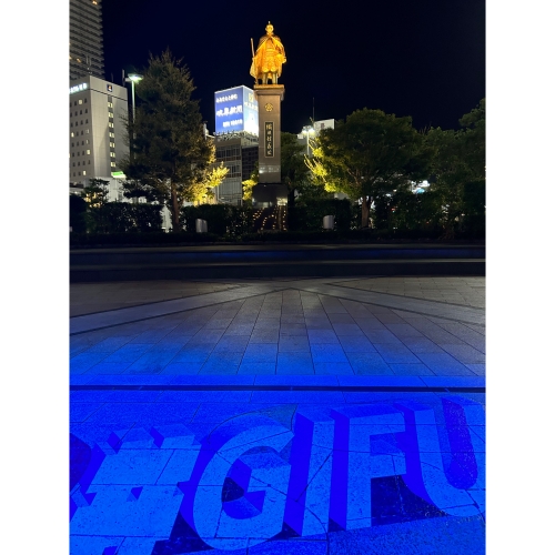 JR岐阜駅の北口駅前広場にたつ、マントを羽織った金ピカの織田信長公像。市政120周年を記念して2009年に建てられました。高さ8mの台座に、3mほどの像と大きなもので、とてもよく目立ちます。夜のライトアップされた姿もまた見どころです。