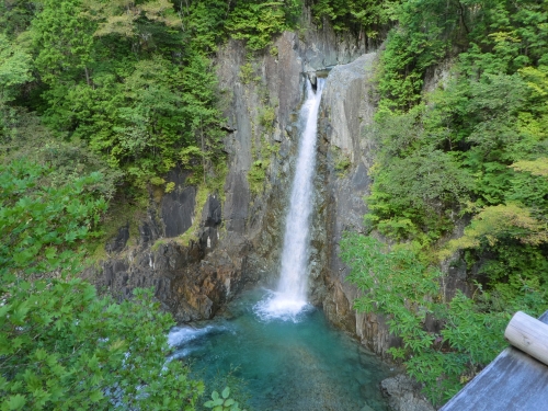 長野県との県境に位置し、背後に高い山々が連なっていることから水量が豊富な滝です。絶壁の岩壁を、轟音を響かせながら大量の水が流れ落ちています。