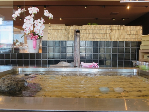 お店の外では勢いよく湧き出る「菓生の泉」が見られ、同じ湧水が店内にも!水槽の中で、お猪口に入って清らかな水で冷やされている水まんじゅうの様子はなんとも涼しげで、水の都大垣ならではの光景ですね。