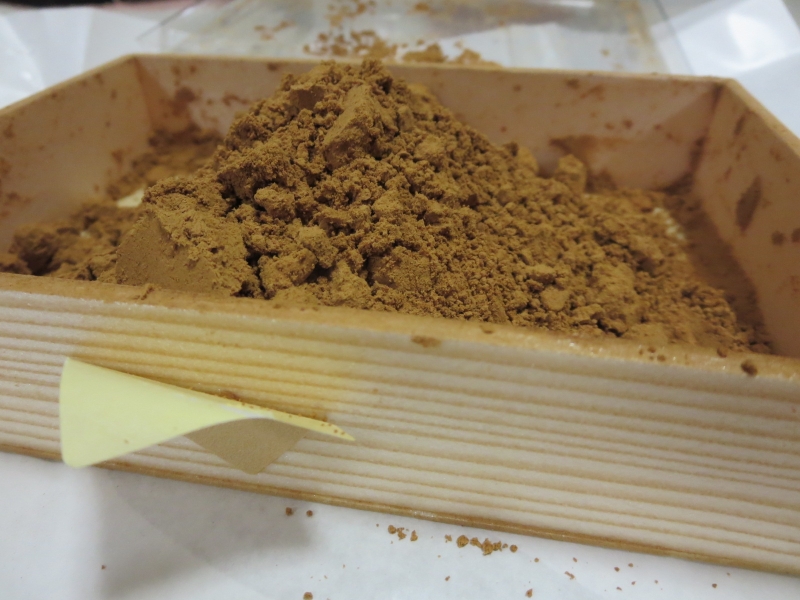 1個の大きさは、なんと約35g!3口くらいで食べなければならないほどのビッグサイズです。上の写真を撮影した後に更にきな粉を乗せていただきましたが、息を止めて口に運ばないと、きめ細かなきな粉が周りに飛び散ってしまいます(笑)。黒文字が付いていますが、お箸のほうがしっかり掴めて食べやすかったです。自然な程よい甘味がなんとも美味しく、滑らかな口どけ♪