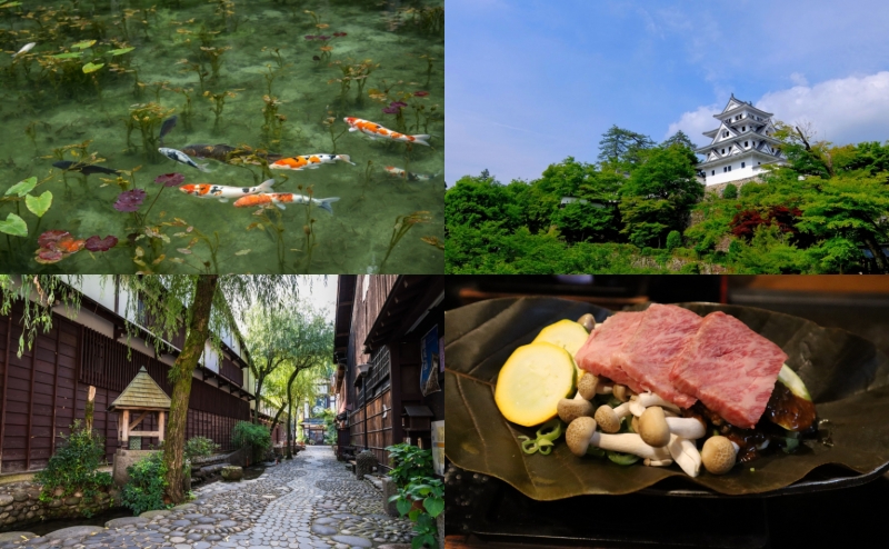 午前中はモネの池・根道神社を訪れ、ランチは飛騨牛の朴葉味噌焼きをはじめとするご当地グルメ、午後は郡上八幡の人気名所であるやなか水のこみち、郡上八幡城をめぐる、岐阜1日観光モデルコースです。主な旅程は以下の通り。