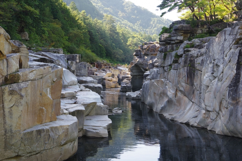 木曽駒ケ岳に続いて訪れる「寝覚の床」は、木曽川の浸食作用によってできた地形で、規則性のある割れ目が美しい景勝地。花崗岩のため岩肌は白く、エメラルドグリーンのような川の色とのコントラストが楽しめます。国の名勝に指定されているほか、木曽八景の一つにも数えられています。