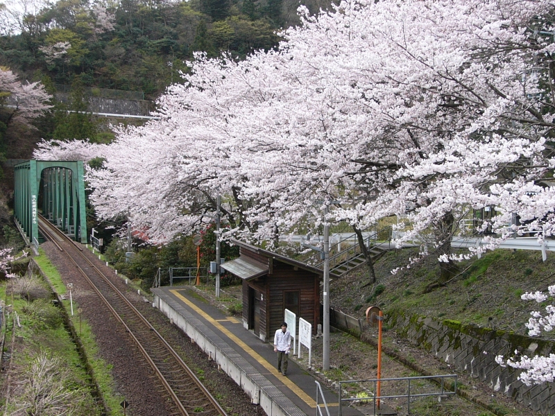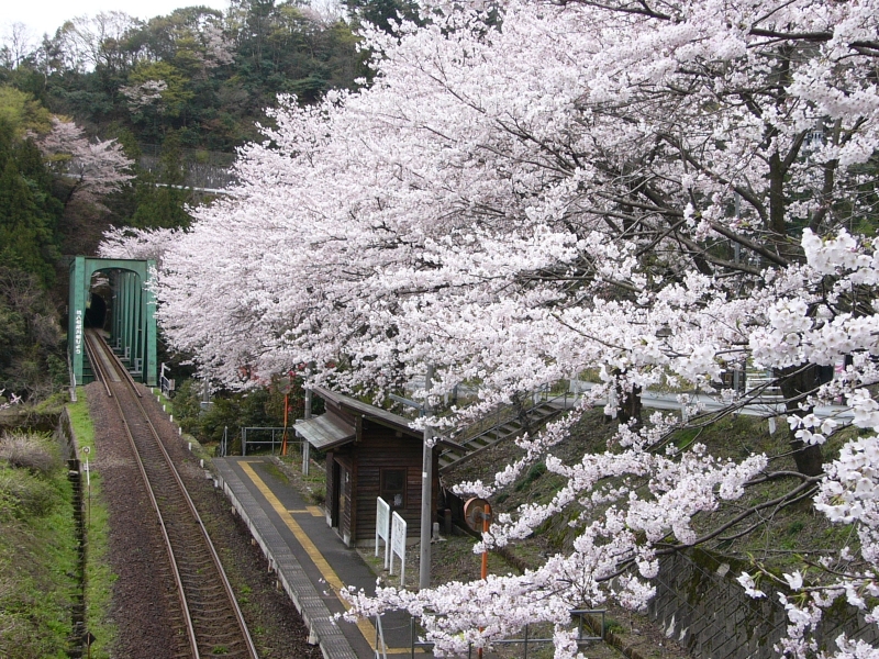 駅のホームに覆いかぶさるような桜並木と、ホームと電車のコントラストがとても素敵な駅です。