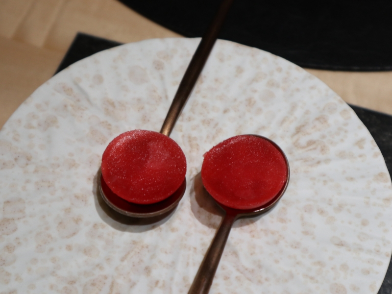 お食事前に提供されるアミューズは3品。1品目の「赤紫蘇のグラニテ」は、スプーンに乗った赤い氷菓子。映画『グランメゾン・パリ』公開記念メニューとして期間限定で提供されています。赤紫蘇を煮出したエキスで作られたシャーベットと、オリーブオイルの調和が素晴らしい一品。
