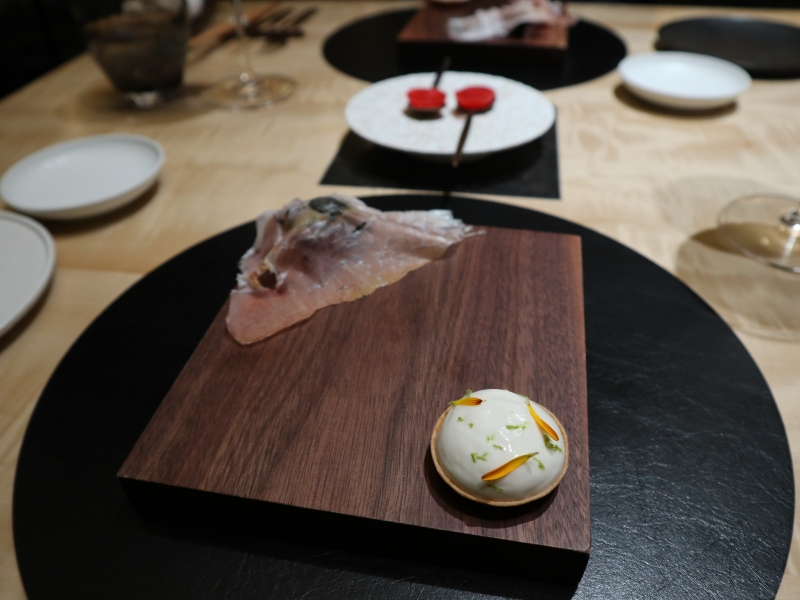 3品目は、パスタ生地で作られている真っ黒の揚げパン「ニョッコフリット」に、日本の黒豚の生ハムがのったアミューズ。薄い生ハムとサクッと軽い食感の揚げパンは、口の中であっという間になくなります。