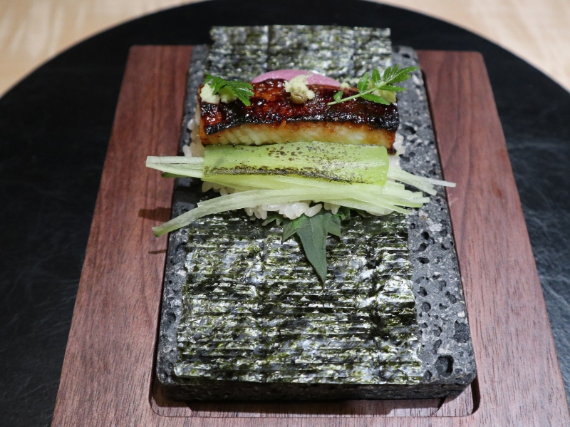 熱々の溶岩の上にのった斬新な巻き寿司。海苔はパリパリで、かすかにワサビの味も感じる“うなきゅう”は、見た目も味も繊細です。