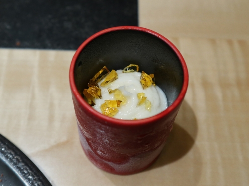 2品目の「ヨーグルトムースのタルトレット」は、下の方に鰆のタルタルが入っています。(映画の中でも似たタルトレットが出てきますが、鰯のタルタルです。)軽くて何個でも食べれそうな美味しさ。