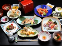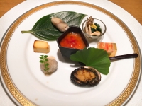 手前から時計回り:床節磯焼き、里芋豊年万頭、チーズ黄金焼、〆魚握り、菊菜浸し/木の子、蟹サフラン寄せ、新いくら茶碗蒸し