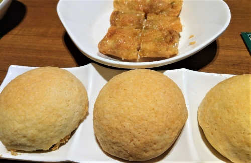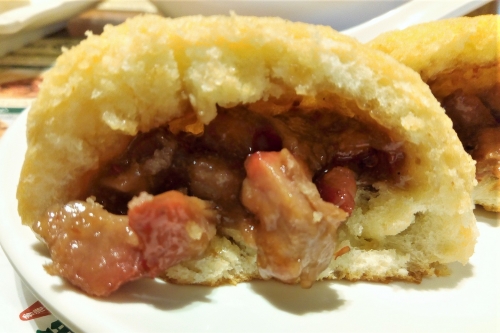 まず一番のお目当ては、ティムホーワン名物の「ベイクドチャーシューパオ」(580円+税、以下同)。メロンパンのようなさっくりとした生地の中に、角切りのチャーシューがゴロゴロ入っています。パン生地の甘さと、チャーシューの塩辛さがマッチしてこれまでに味わったことのない、独特な風味。「ティムホーワン」を訪れたなら、絶対に試してみたい一品です。