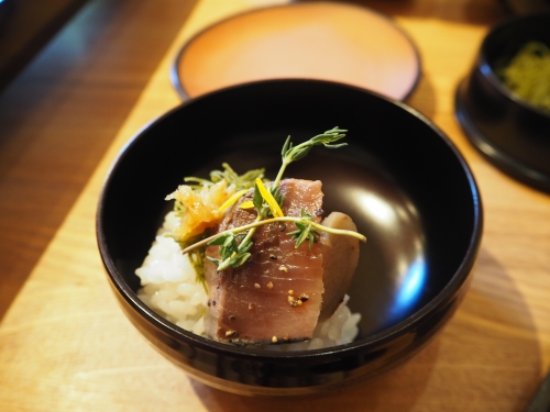 以下は8皿目。炙り巻きゆばのたいたん・ゴボウのたいたん・カツオと自家製入酒カルパッチョ。
