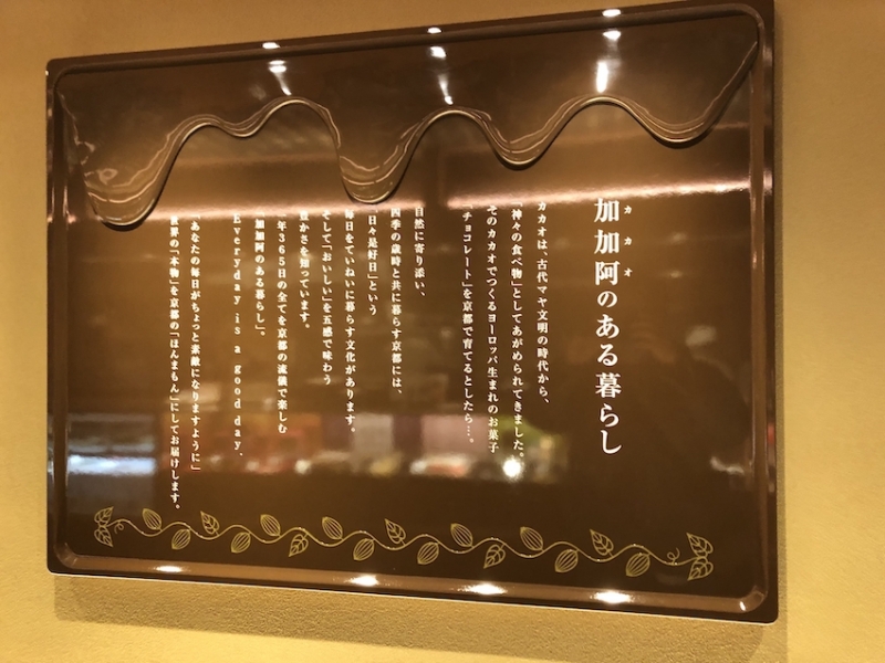 「古代マヤ文明の時代から神々の食べ物と崇められていたカカオを用いて、ヨーロッパで誕生した」というチョコレートの原点に立ち返り、「日々是好日」という京都の流儀とミックスしたチョコレートを販売しています。