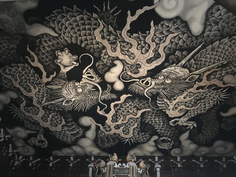 畳108枚分もの天井一面に描かれた龍。二匹の龍がいるのですが、一匹は口を閉じ、もう一匹が口を開けており、阿吽の呼吸を表わしています。法堂の中に足を踏み入れた途端、見る人の目を惹きつける迫力を持つ二匹の龍。その大規模な作品を食い入るように見つめてしまうことでしょう。