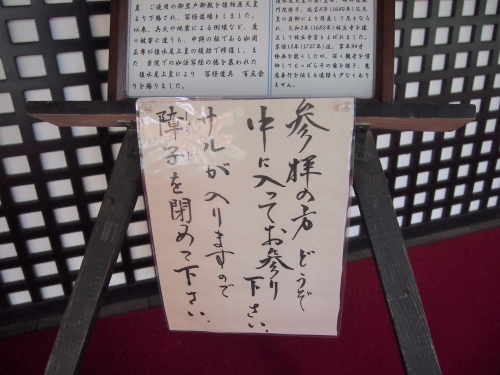 昭和41年に重要文化財に指定された「本堂の龍華殿」は、お薬師さんの愛称で知られている薬師如来三尊像が安置されています。こちらは写経場にもなっています。扉が閉まっているため入っていいのか躊躇してしまいますが、門の前に立ってみて納得です。皆さん猿に注意してくださいね(笑)。