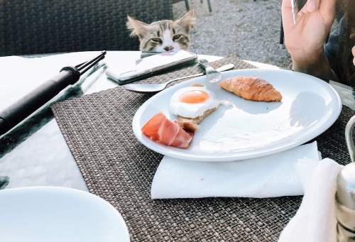 ミコノス島に泊まる際、ホテルに朝食がついていると非常にお勧めです。ミコノス島の夜は実は長く、中心街は明け方まで地元の人が飲み騒いでいる、陽気な街です。逆に言うと、朝はどのほとんどの飲食店がいったんしまってしまい、早くても10:00~11:00頃からオープン、というお店が多いです。