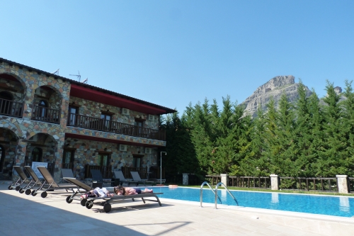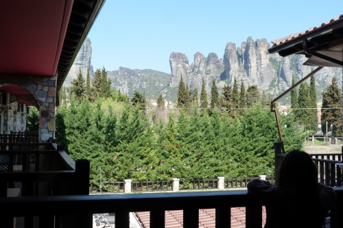 カランパカに列車が到着すると、出口付近に「Visit Meteora」のスタッフがミニバスとともに待ってくれています。そのバスに乗って、3つ星もしくは4つ星のホテルへと送ってもらいます。筆者の宿泊先は「モナスティリ ゲストハウス(Monastiri Guesthouse)」という名前のゲストハウスでした。プールも付いており、部屋のバルコニーからは、メテオラの絶景を垣間見ることができます!