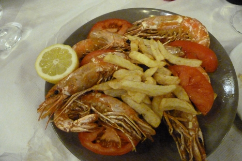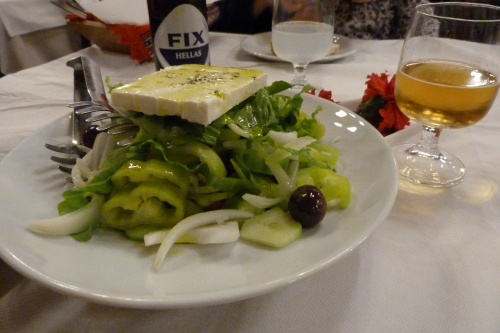 筆者が参加したツアーには、カランパカにある指定レストランでの夕食券もついていたため、1日目と2日目の夜はそちらで夕食をとります。スターターとメインからそれぞれ1つずつ好きなものを選べるとのことで、スターターにはグリークサラダを、メインにはグリルした海老をいただきました。どちらもとっても美味しかったです!なお、飲み物は含まれていないため、飲み物代だけを食後に支払います。