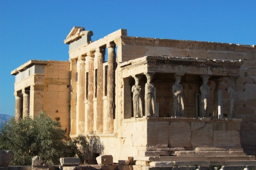 アテナイのアクロポリスで最も有名なのが、【1】で紹介したパルテノン神殿。そしてパルテノン神殿に向かい合って立つのが、イオニア式の神殿であるエレクティオンで、そのほかアテーナー・ニーケー神殿、イロド・アティコス音楽堂など、見ごたえのある遺跡が多くあります。