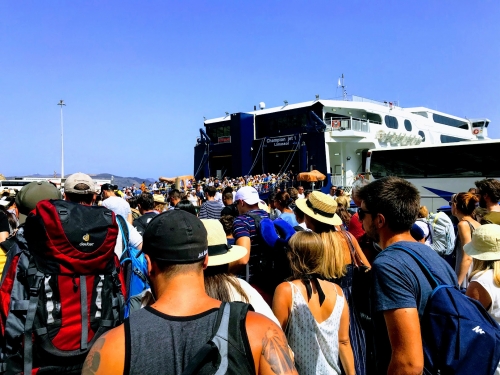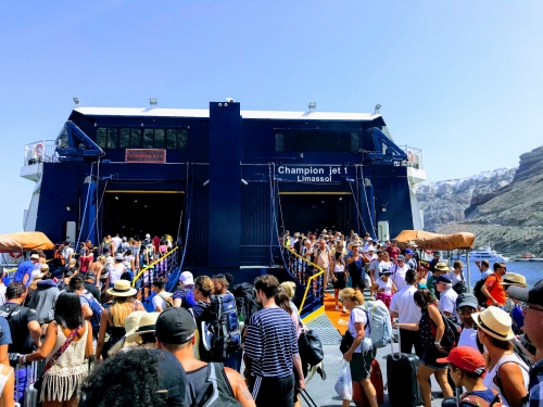 船がくると、さらにたくさんの人が集まります。特にサントリーニ島は人気の島なので、降りてくる人の数も非常に多いです。比較的治安のいいサントリーニ島でも、ここは外国。スリなどには十分お気を付けください。
