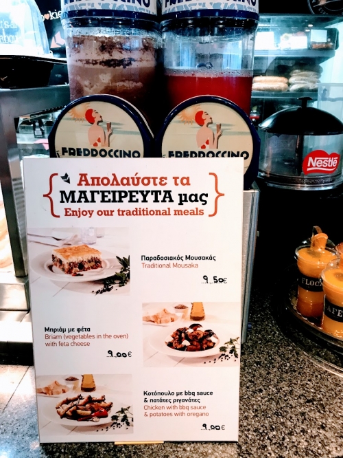 エーゲ海を運行するフェリーには大抵、小さなカフェが船内にあります。目的の島についてから、観光の予定が詰まっている人や、Santorini Portで食事の時間が取れなかった人は、ここでお腹を満たしておくのもいいですね。