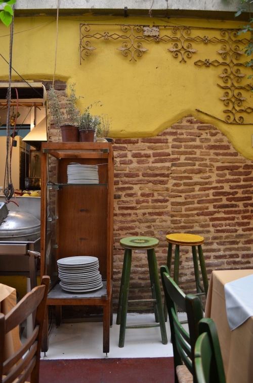 お店のエントランス付近のテーブルからは、厨房が見えています。窓の下に三つ並んでいる丸いものは調理鍋で、中では肉や野菜が煮込まれていました。
