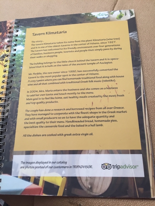 メニューは英語とギリシャ語のものがあります。「Taverna Klimataria」のお店の歴史などに関する文章も書かれています。