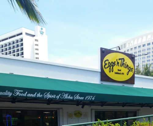 日本にパンケーキブームを巻き起こした先駆けのショップ「エッグスンシングス」。グアム店は繁華街のタモン地区にあり、外観も店内もアメリカの雰囲気が漂います。人気のお店だけに、グアムでもやはり行列必至!エッグスンシングスの代名詞とも言える、「これでもか!」と盛られた生クリームのパンケーキ。しかし生クリームは見た目よりあっさりしており、また生クリームなしをオーダーすることもできます。そしてグアム限定の食事メニューもあり、甘いものが苦手な人も安心して食事をすることができます。