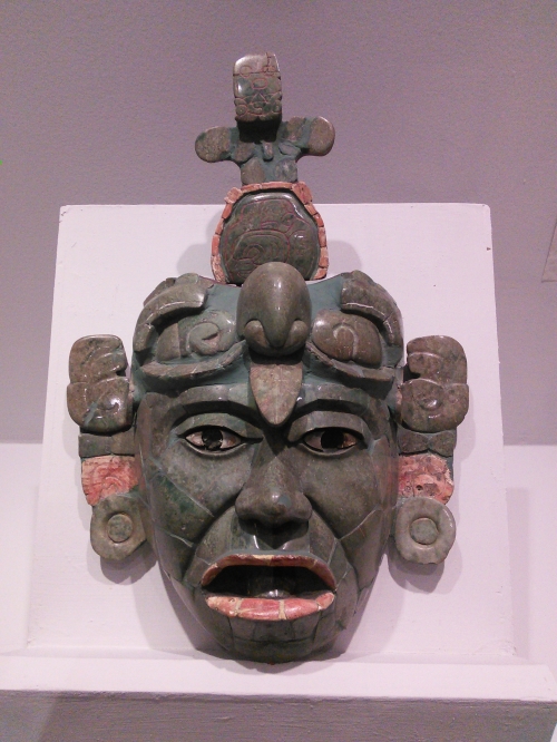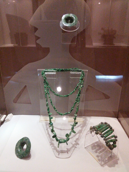 下の写真は、先ほどご紹介したティカ遺跡のⅠ号神殿に埋蔵されていたキング・ハサウの副葬品である翡翠(ヒスイ)です。マヤ文明では、翡翠は金(GOLD)よりも貴重とされていました。