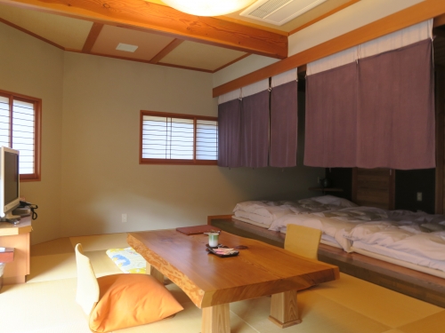 全13室のうち、3室のみが別館になります。今回は別館の「つばき」という客室を紹介します。「つばき」の部屋はメゾネットになっていて、客室入口を入ると和室とベッドスペースがあります。