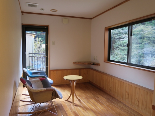 室内階段を降りるとダイニングルームがあり、その奥に可愛らしいロッキングチェアで寛げるティールーム、そしてお風呂があります。