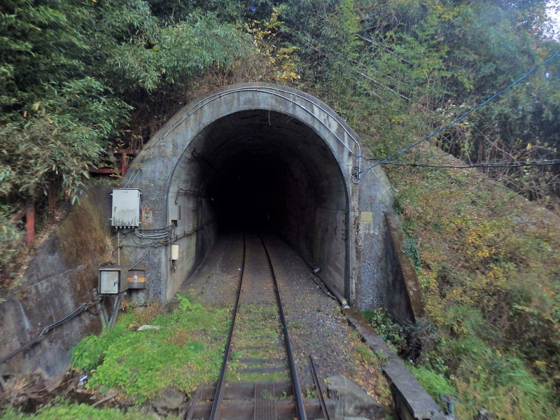 神戸駅をすぎると現れる草木トンネル。全長は5,000メートルを越えます。草木ダムの建設にともない作られたトンネルで、ダムの完成によって、かつて神戸駅のとなりにあった草木駅の跡地は湖の底へ沈みました。