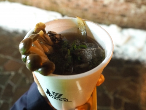 巨大ツリーのあるメインストリート沿いでは、特設会場にてスープを販売しています。各お店が軒を連ねて、クリスマスまでの間、約15種類のスープを販売。スープといえど、洋風から和風、そしてデザート系も。どのスープも一杯600円で楽しめますよ。チケット制なので、informationでチケットを購入して楽しみましょう。