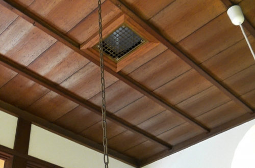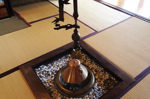 家訓の2番目には、勤倹と書かれているとおりで、当主の部屋には囲炉裏がありますが、他の部屋は火鉢だけだったことから、囲炉裏の暖かい空気が2階も温める工夫をしてあります。
