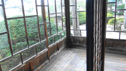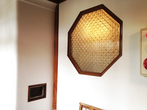 柄の入ったガラスは、当時の日本では、まだ造ることが出来なかったそうです。洋室の壁に付けられたガラスは海外からの輸入品で、大きさから考えても大変高価な品だったことが分かります。このガラスの向こう側は廊下になっており、洋室の明かりで廊下を照らす効果がありました。