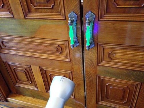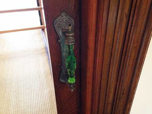 洋室の取っ手は、当時ヨーロッパで流行っていたガラスで、ライトを当てると発光します。