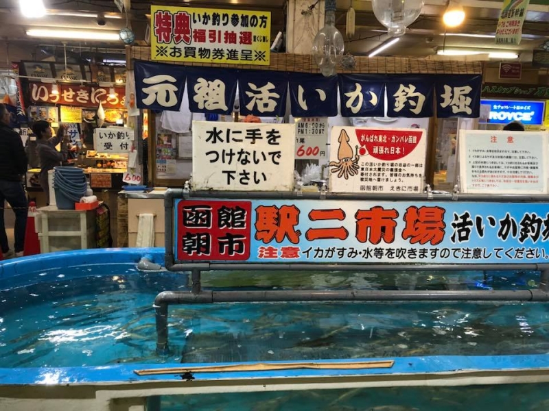 活イカは日本全国でも食べられる場所が限られており、とくに函館の活イカは、漁法がちがうためおいしいとされています。函館朝市内にある、2階建ての屋内市場「えきに市場」。こちらの「元祖活いか釣堀」では、なんとその日に水揚げされたばかりのイカを1回600円(時価)~で釣ることができます。
