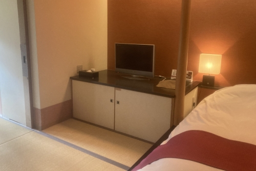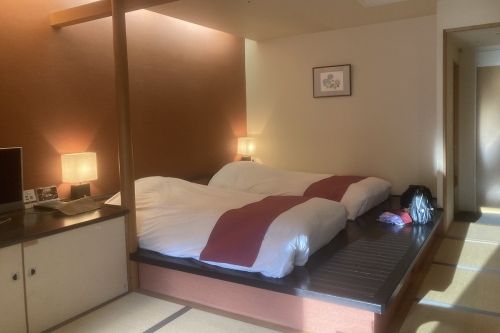 「季の湯 雪月花」は、2~3名用もしくは2~4名用の和洋室、洋室ツイン、洋室ダブルの4タイプ158室全てに客室露天風呂が付いている温泉旅館です。筆者が宿泊した、「花の庄」和洋室の部屋(2~3名用)は、広めの和室と小上がりにベットが2つあります。(3名で宿泊する場合はテレビ台の下にある布団を敷いて寝ます。)
