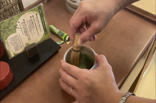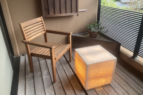 その他の客室設備としては、トイレ、シャワールーム、洗面台があります。テラスにはゆったりと座って夕涼みできる椅子とダイス状のテーブル、そして、泉質は温泉ではありませんが、この宿の目玉の1つでもある客室露天風呂があります。また室内に抹茶を点てる道具があり、簡易的ではありますが抹茶を点てる体験ができます。
