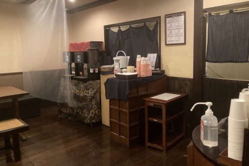 1階には、無料でコーヒーやお茶などを飲める「桜茶屋」があります。この桜茶屋は6:00~24:00とかなりの長時間開いていますので、それぞれのタイミングでゆっくりとできるのではないでしょうか。なお、各テーブルはコロナ対策のためビニールのカーテンで仕切られています。